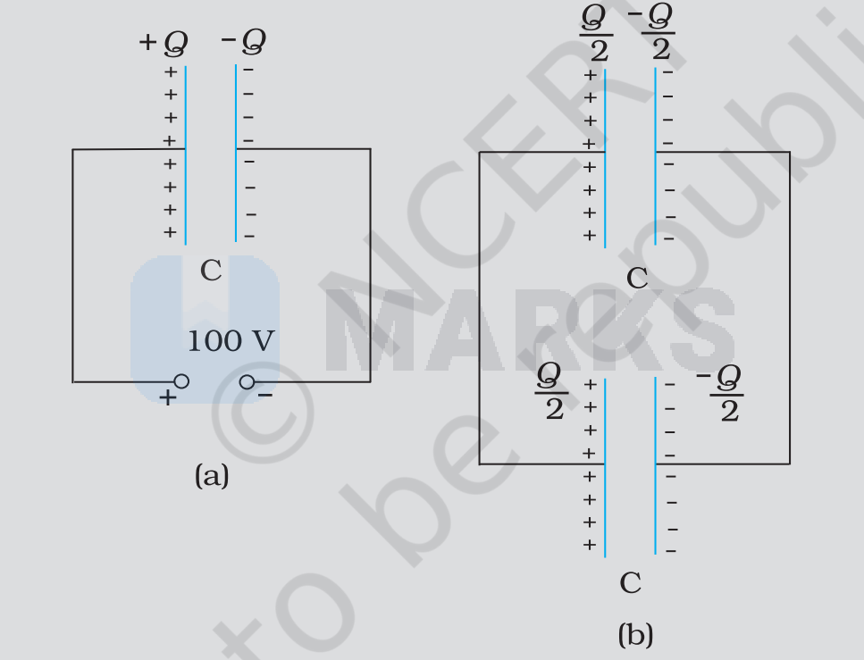 A 900 pF capacitor is charged by 100 V battery Fig(a). The capacitor is disconnected from the battery and connected to another 900 pF capacitor [Fig.(b)]. What is the electrostatic energy stored by the system?
