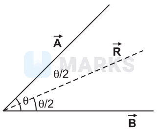 If $\overrightarrow{\mathbf{A}}$ and $\overrightarrow{\mathbf{B}}$ having equal magnitudes they will make equal angles from resultant $\overrightarrow{\mathbf{R}}$ If angle between $\overrightarrow{\mathbf{A}}$ and $\overrightarrow{\mathbf{B}}$ is $\theta$. Then the angle between $\overrightarrow{\mathbf{A}}$ or $\overrightarrow{\mathbf{B}}$ with their resultant is $\frac{\theta}{2}$.