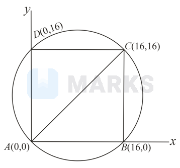 is a square with side units and is the origin. If the equation of the circle circumscribing the square is then