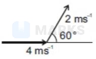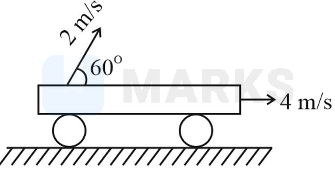 A ball is projected with a speed of with respect to a trolley which is moving with , as shown in the figure. The angle at which ball is projected with respect to the horizontal in ground frame is