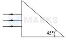 A beam of light consisting of red, green and blue colours is incident on an isosceles right angled prism as shown in the figure. The refractive indices of the material of the prism for red, green and blue colours are and respectively. The prism will