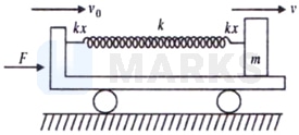 As the block was initially stationary and it will acquire a velocity v0 equal to that of the plank at the time of maximum compression of the spring, the change in kinetic energy of the block relative to ground is