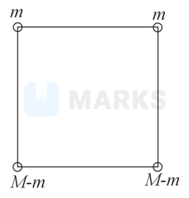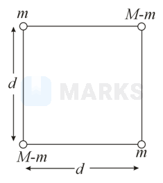 A body of mass splits into four masses which are rearranged to form a square as shown in the figure. The ratio of for which, the gravitational potential energy of the system becomes maximum is The value of is ________.