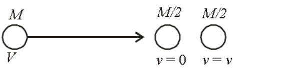 A body of mass $M$ moving with velocity $V$ explodes into two equal parts. If one comes to rest and the other body moves with velocity $v$, what would be the value of $v$ ?