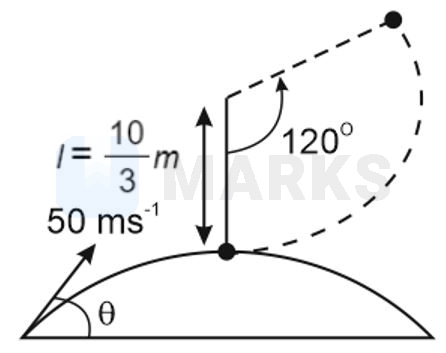 A bullet of mass is fired with a velocity of at an angle with the horizontal. At the highest point of its trajectory, it collides head on with a bob connected to massless string of length and gets embedded in the bob of mass . After the collision, the string moves to an angle of . What is the angle ?