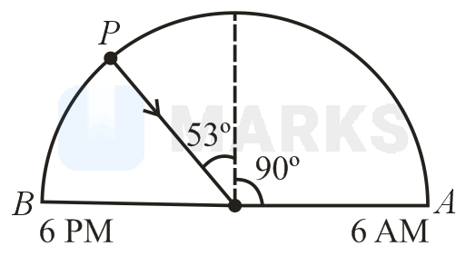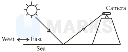 A camera filled with a polarizer is placed on a mountain, in a manner to record only the reflected image of the sun from the surface of a sea as shown in the figure. If the sun rises at and sets at during the summer, then at what time in the afternoon will the recorded image have the lowest intensity, assuming there are no clouds and intensity of the sun at the sea surface is constant throughout the day? (Refractive index of water )