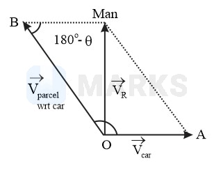 In the vector diagram, and represent the velocity vectors for the car and the parcel, respectively. is the resultant velocity vector. Let be the angle between and . Then,