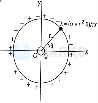 A charge is distributed over a thin ring of radius $r$ with line charge density . Note that the ring is in the -plane and is the angle made by with the -axis. The work done by the electric force in displacing a point charge from the centre of the ring to infinity is