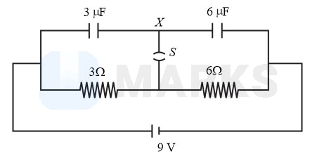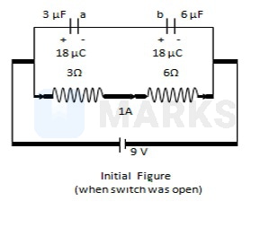 A circuit is connected as shown in the figure with switch open. When the switch is closed, the total amount of charge that flows from to is