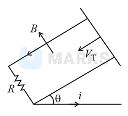 A copper rod of mass slides under gravity on two smooth parallel rails distance apart and set an angle to the horizontal. At the bottom, the rails are joined by a resistance in figure. There is a uniform magnetic field perpendicular to the plane of the rails. The terminal velocity of rod is