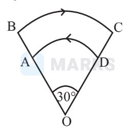 A current carrying loop $\mathrm{ABCD}$ has two circular arcs $\mathrm{AD}$ and $\mathrm{BC}$ with radius $1 \mathrm{~cm}$ and $2 \mathrm{~cm}$ respectively as shown in the figure. The two arcs $\mathrm{AD}$ and $\mathrm{BC}$ subtend a common angle $30^{\circ}$ at the centre $\mathrm{O}$. If the current flowing in the loop is $\frac{1.2}{\pi} \mathrm{A}$, then the magnitude of net magnetic field at $O$ is (Given $\mu_0=4 \pi \times 10^{-7}$ )