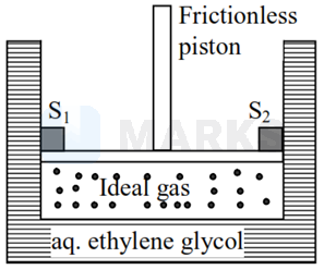A Cylinder containing an ideal gas (0.1 mol of ) is in thermal equilibrium with a large volume of 0.5 molal aqueous solution of ethylene glycol at its freezing point. If the stoppers and (as shown in the figure) are suddenly withdrawn, the volume of the gas in litres after equilibrium is achieved will be