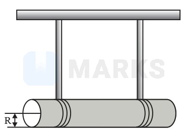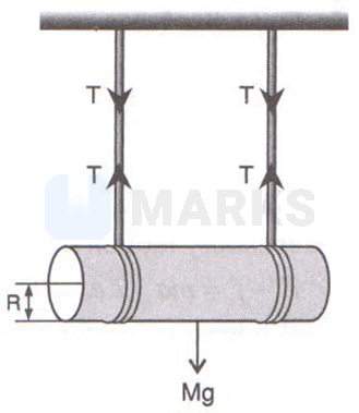 A cylinder of mass , length and radius has two cords wound around it with their ends attached to the ceiling, as shown in the figure. The cylinder is held horizontally with the two cords vertical. When the system is released from rest, the linear acceleration of the cylinder as it falls will be