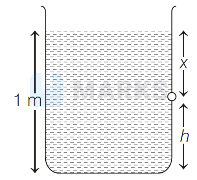 A cylindrical vessel is filled with water upto the height $1 \mathrm{~m}$ from the base. A small orifice is opened at some height in the cylinder and the water level is reduced to height of orifice in $20 \mathrm{~s}$. If the base area of the cylinder is 100 times the area of orifice, then the height of orifice from the base is (take, $g=10 \mathrm{~m} / \mathrm{s}^2$ )
