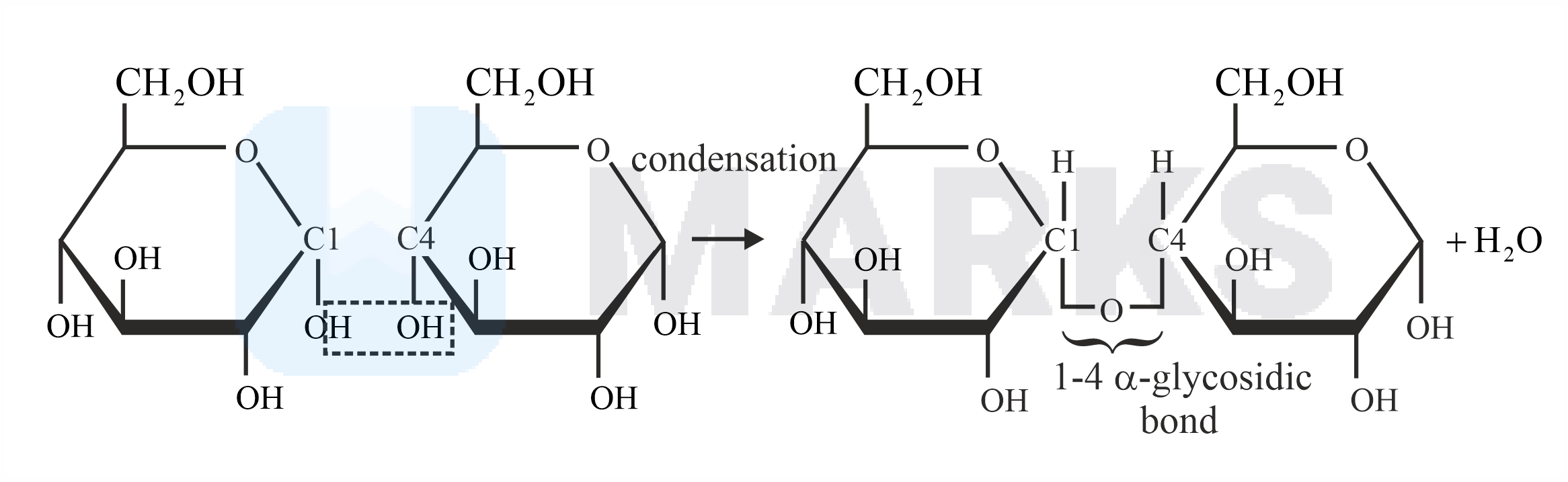 Maltose is a common disaccharide that is formed by the dehydration reaction of two glucose molecules. The glycosidic bond present in maltose is . During the formation, from two glucose molecules, one molecule of water is removed.