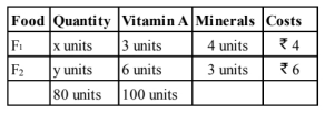 vitamin $\mathrm{A}$ contained in food $\mathrm{F}_1$ and $\mathrm{F}_2=3 \mathrm{x}+6 \mathrm{y}$ least units of vitamin $A=80$ units quantity mineral required $=100$ units