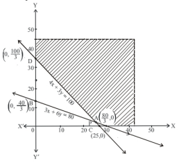(ii) The line $4 x+3 y=100$ passes through $\mathrm{C}(25,0), \mathrm{D}\left(0, \frac{100}{3}\right)$ putting $x=0, y=0$ in $4 x+3 y \geq 100,0 \geq 100$ which is not true. $\Rightarrow 4 x+3 y \geq 100$ lies on and above $C D$.