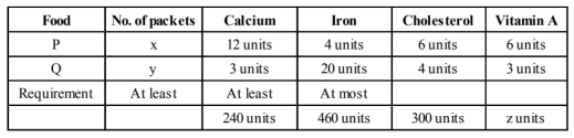A dietician has to develop a special diet using two foods $\mathbf{P}$ and Q. Each packet (containing $30 \mathrm{~g}$ ) of food $P$ contains 12 units of calcium, 4 units of iron, 6 units of cholesterol and 6 units of vitamin A. Each packet of the same quantity of food $Q$ contains 3 units of calcium, 20 units of iron, 4 units of cholesterol and 3 units of vitamin A. The diet requires atleast 240 units of calcium, atleast 460 units of iron and atmost 300 units of cholesterol. How many packets of each food should be used to maximise the amount of vitamin $A$ in the diet? What is the maximum amount of vitamin A in the diet?