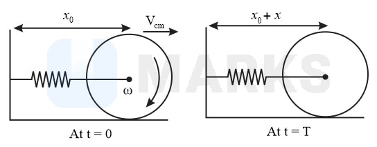 A disc of mass and radius has a spring of constant k attached to its centre, the other end of the spring being fixed to a vertical wall. If the disk rolls without slipping on a level floor, how far to the right does the centre of mass move, if initially the spring was unstretched and the angular speed of the disc was