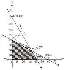So, to find $x$ and $y$ such that $Z=7 x+10 y$ is maximum subject to $2 x+3 y \leq 120,2 x+y \leq 80$, $x \geq 0$ and $y \geq 0$. The feasible portion of the graph satisfying the inequalities $2 x+3 y \leq 120$ and $2 x+y \leq 80$ is $\mathrm{OABC}$ which is shaded in the figure. Coordinates of O, $\mathrm{A}, \mathrm{B}$ and $\mathrm{C}$ are $(0,0)$, $(0,40),(30,20)$ and $(40,0)$ respectively.