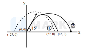 A firecracker is thrown with velocity of $30 \mathrm{~ms}^{-1}$ in a direction which makes an angle of $75^{\circ}$ with the vertical axis. At some point on its trajectory, the firecracker splits into two identical pieces in such a way that one piece fall 27 $\mathrm{m}$ far from the shooting point. Assuming that all trajectories are contained in the same plane, how far will the other piece fall from the shooting point ? (Take $\mathrm{g}=10 \mathrm{~ms}^{-2}$ and neglect air resistance)-