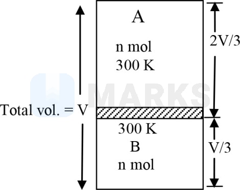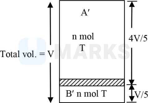 A gas is present in a cylinder fitted with movable piston. Above and below the piston there is equal number of moles of gas. The volume above is two times the volume below at a temperature of . At what temperature will the volume above be four times the volume below-