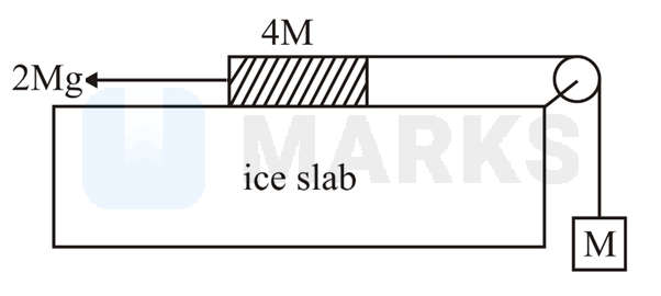 A hanging mass is connected to a four times bigger mass by using a string pulley arrangement, as shown in the figure. The bigger mass is placed on a horizontal ice-slab and being pulled by force. In this situation, tension in the string is for _____. Neglect mass of the string and friction of the block (bigger mass) with ice slab.