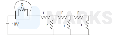 A light bulb of resistance $R=16 \Omega$ is attached in series with an infinite resistor network. with identical resistances $\mathrm{r}$ as shown below. A $10 \mathrm{~V}$ battery derives current in the circuit. What should be the value of $r$ such that the bulb dissipated about $1 \mathrm{~W}$ of power.