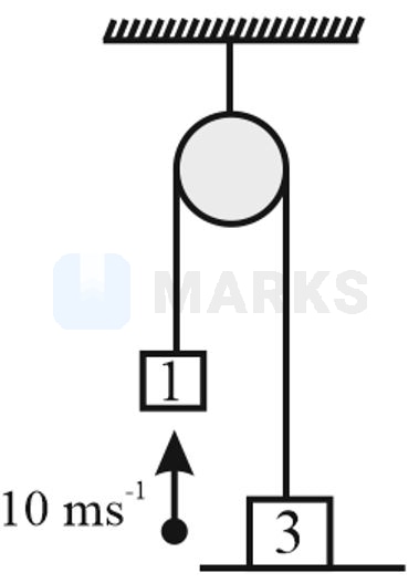 A light inelastic thread passes over a small frictionless pulley. Two blocks of masses and , respectively, are attached with the thread and heavy block rests on a surface. A particle of mass moving upward with a velocity of collides with the lighter block and sticks to it. The speed of the bigger block just after the string is taut will be []