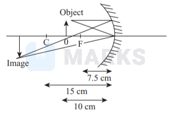 Since radius of curvature is \( 15 \mathrm{~cm} \), so focal length \( =\frac{15}{2}=7.5 \mathrm{~cm} \)