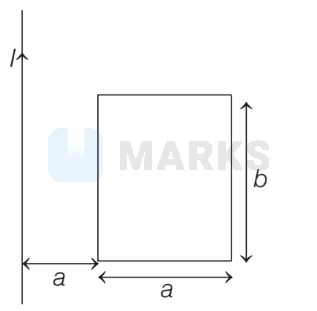 A long straight wire carrying current $I$ and a rectangular frame with side lengths $a$ and $b$ lie in the same plane as shown in the figure. The mutual inductance of the wire and frame is
