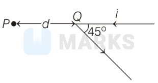 A long straight wire carrying electric current ' $i$ is bent at its mid-point to form an angle of $45^{\circ}$ as shown in the figure. Magnetic field at a point $P$ at a distance $d$ from the point $Q$ of bending is