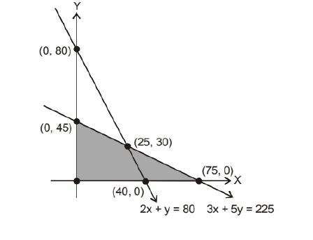 Subject to $3 x+5 y \leq 225,2 x+y \leq 80, x \geq 0, y \geq 0$