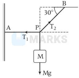 $\mathrm{T}_2 \cos 60^{\circ}=\mathrm{Mg}$