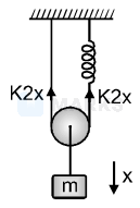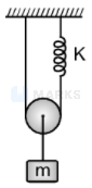 A mass \( \mathrm{m} \) is suspended from a massless pulley, which it self is suspended by a massless string and a spring as shown in figure. The force constant of spring is \( \mathrm{K} \). What will be the time period of oscillation of \( \mathrm{m} \) :