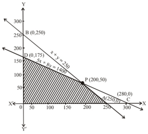 objective function to maximise $Z=4500 x+5000 y$ and constraints are $x+y \leq 250,5 x+8 y \leq 1400 x, y \geq 0$