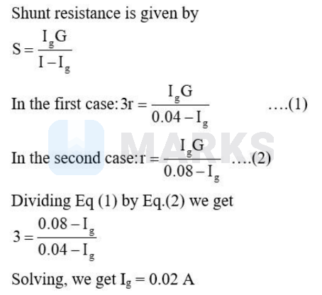 A moving coil galvanometer is converted into an ammeter, reading up to $0.04 \mathrm{~A}$ by connecting a shunt of resistance ' $3 \mathrm{r}$ ' across it and then into an ammeter reading up to $0.8 \mathrm{~A}$, when a shunt of resistance ' $r$ ' is connected across it. What is the maximum current which can be sent through this galvanometer if no shunt is used?