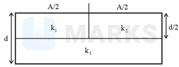 A parallel plate capacitor of area , plate separation and capacitance is filled with three dielectric materials having dielectric constants as shown. If a single dielectric material is to be used to have the same capacitance in the capacitor, then its dielectric constant is given by