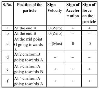 A particle is in linear simple harmonic motion between two points $A$ and $B, 10 \mathrm{~cm}$ apart. Take the direction from $A$ to $B$ as the positive direction and give the signs of velocity, acceleration and force on the particle when it is