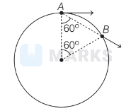 $\begin{aligned} & \text { Given, velocity of particle } v=10 \mathrm{~m} / \mathrm{s} \\ & \text { radius }\left(r^{\prime}\right)=5 \mathrm{~m} \\ & \text { Angular displacement }(\theta)=60^{\circ} \\ & \therefore \quad \theta=60 \times \frac{\pi}{180} \mathrm{rad} \\ & \Rightarrow \quad \theta=\frac{\pi}{3} \mathrm{rad} \\ & \end{aligned}$