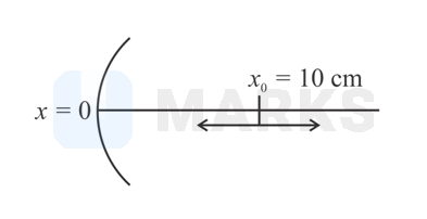A particle is oscillating on the -axis with an amplitude about the point with a frequency. A concave mirror of focal length is placed at the origin (see figure).