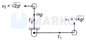A particle is suspended by a light vertical inelastic string of length from a fixed support. At its equilibrium position, it is projected horizontally with a speed . What is the ratio of the tension in the string in its horizontal position to when the particle is vertically above the point of support?