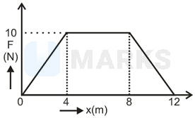 A particle of mass is subjected to a force which varies with distance as shown in the figure. If it starts its journey from rest at , its velocity at is