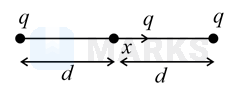 A particle of mass and charge is lying at the mid-point of two stationary particles kept at a distance when each is carrying same charge . If the free charged particle is displaced from its equilibrium position through distance . The particle executes SHM. Its angular frequency of oscillation will be _______ (if )