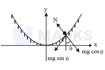 A particle of mass is allowed to oscillate near the point of minima of a vertical parabolic path having the equation , where is along the horizontal direction and is along the vertical direction. The angular frequency of small oscillations of the particle is