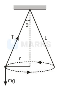 A particle of mass is suspended from a ceiling through a string of length . The particle moves in a horizontal circle of radius . The speed () of the particle and the tension () in the string is