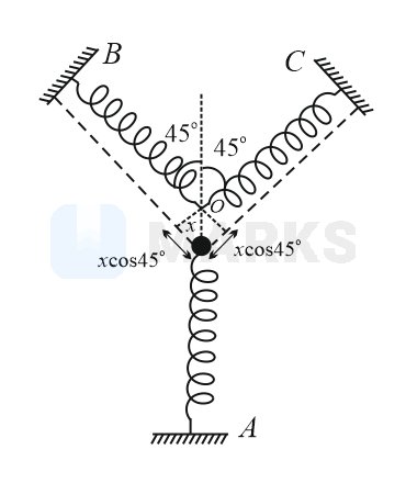 When particle is displaced by a distance x in the downward direction, lower spring is compressed by distance in downward direction and both upper string is displaced by at an angle of from vertical.Due to these compressions and expansions, net force start working on the particle which tries to bring the particle back to its original position.