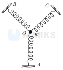 A particle of mass \( \mathrm{m} \) is attached to three identical springs \( \mathrm{A}, \mathrm{B} \) and \( \mathrm{C} \) each of force constant \( \mathrm{k} \) as shown in figure. If the particle of mass \( \mathrm{m} \) is pushed slightly against the spring \( \mathrm{A} \) and released, then the time period of oscillation is -