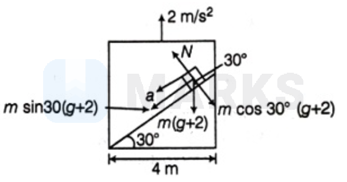 A particle slides down on a smooth incline of inclination , fixed in an elevator going up with an acceleration The box of incline has width 4m. The time taken by the particle to reach the bottom will be