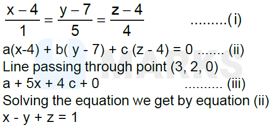 A plane which passes through the point $(3,2,0)$ and the line $\frac{x-4}{1}=\frac{y-7}{5}=\frac{z-4}{4}$ is